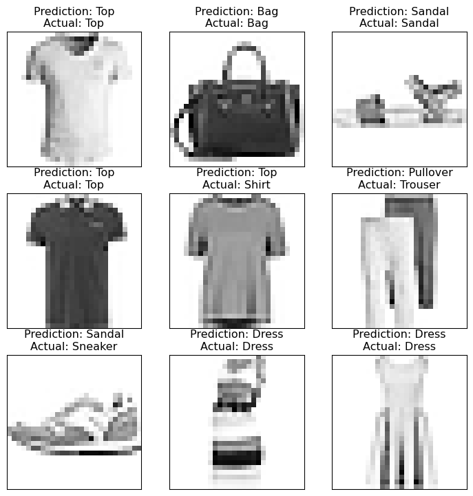 num_samples =9fig, ax = plt.subplots(3, 3, figsize=(9, 9))test_sample =next(iter(test_loader))[:num_samples]test_predictions = torch.argmax(model(test_sample[0].to(device)), dim=1)row =0col =0for i inrange(num_samples): ax[row, col].imshow(test_sample[0][i][0], cmap="Greys") ax[row, col].set_title(f"Prediction: {class_dict[int(test_predictions[i])]}\nActual: {class_dict[int(test_sample[1][i])]}") ax[row, col].set_xticks([]) ax[row, col].set_yticks([]) col +=1if col >2: row +=1 col =0#plt.savefig("test_examples.png")plt.show()
